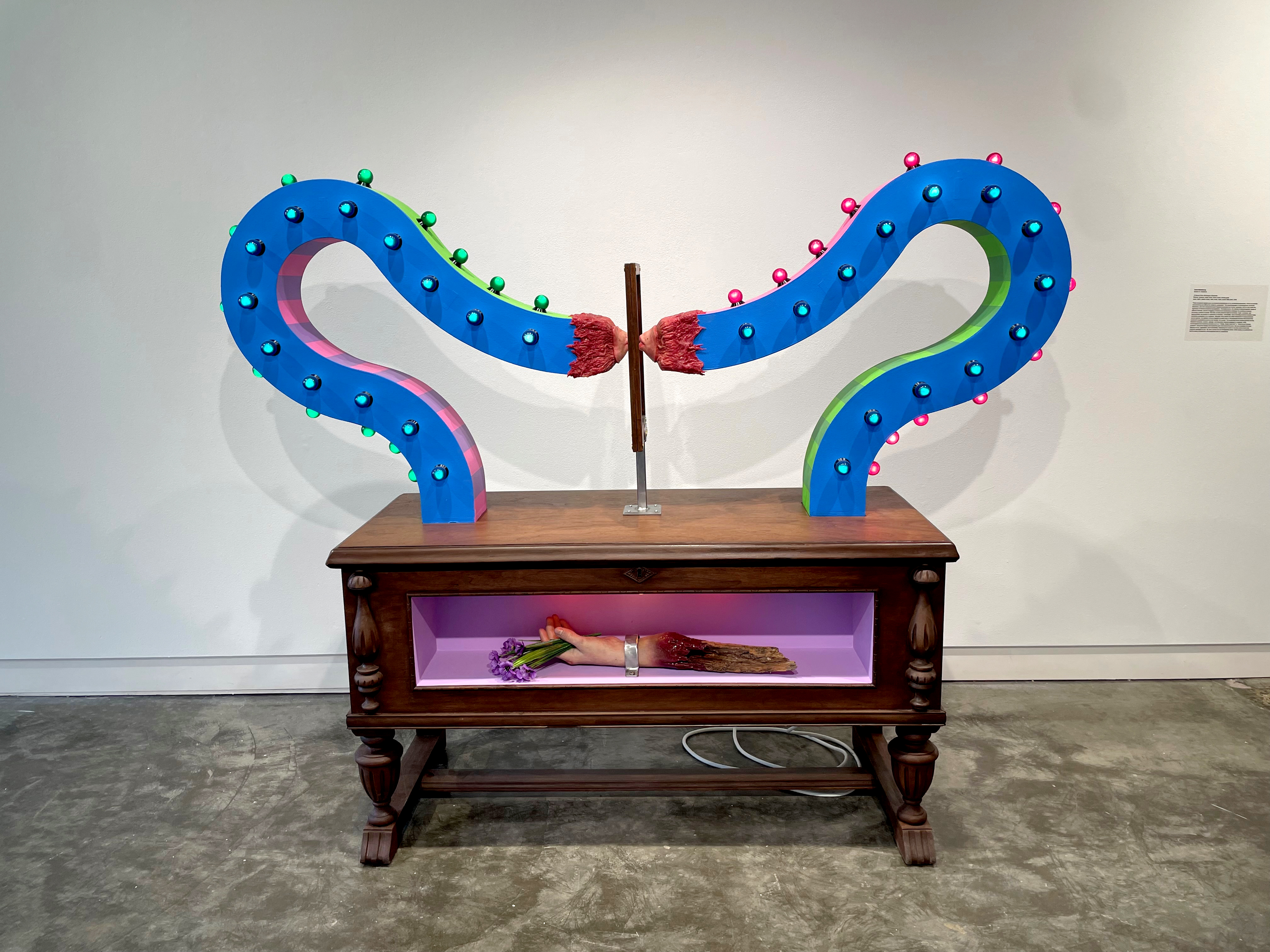 Violet Maimbourg's "10-Minute Elmo Monologue (The Serpent)" received the Best in Show award for graduate students. The winning artwork incorporated mixed media such as silicone, plywood, cedar chest, cherry wood, etched glass panel, lights, plastic violets, steel, brass, foam and acrylic latex paint.
