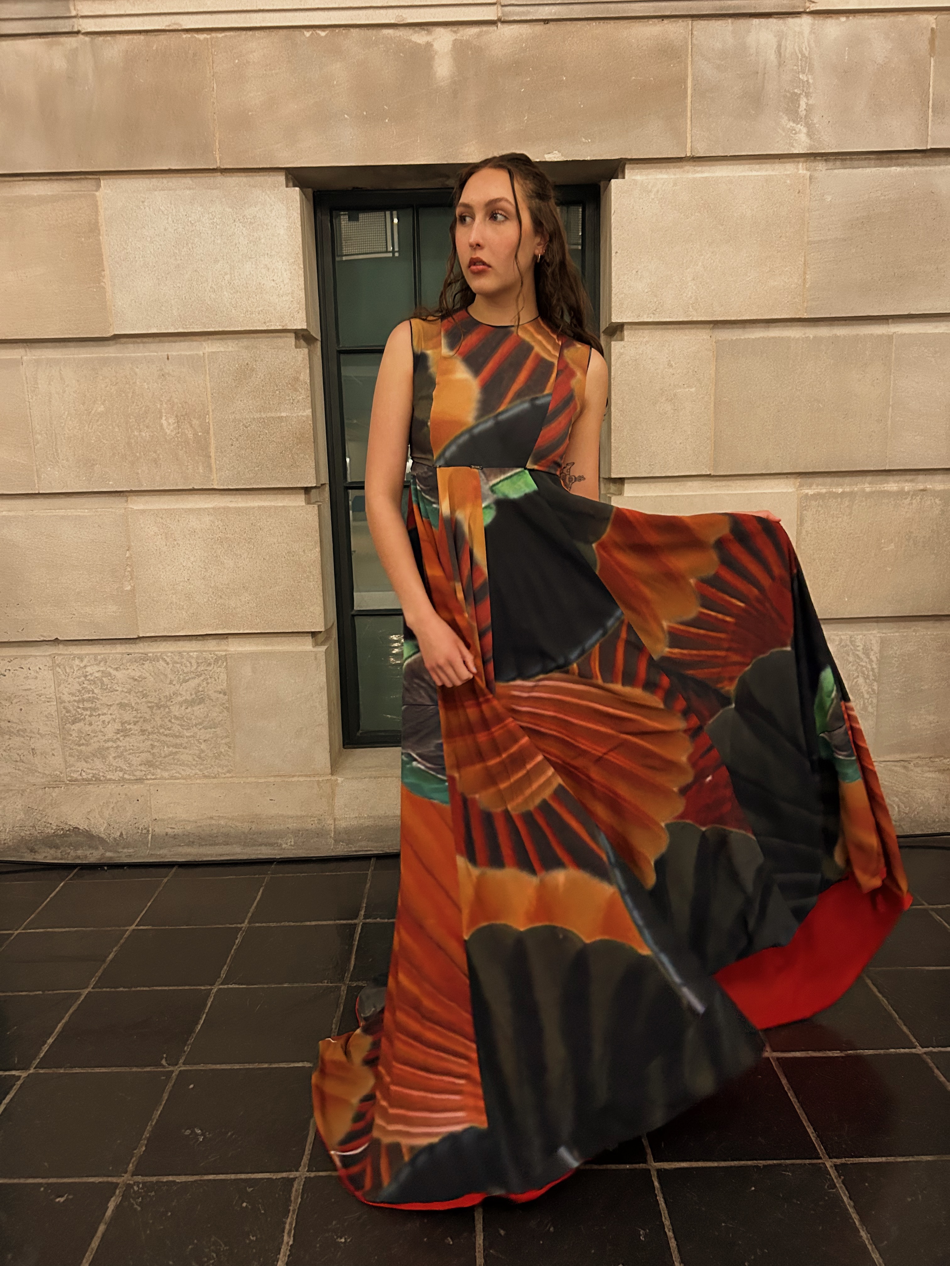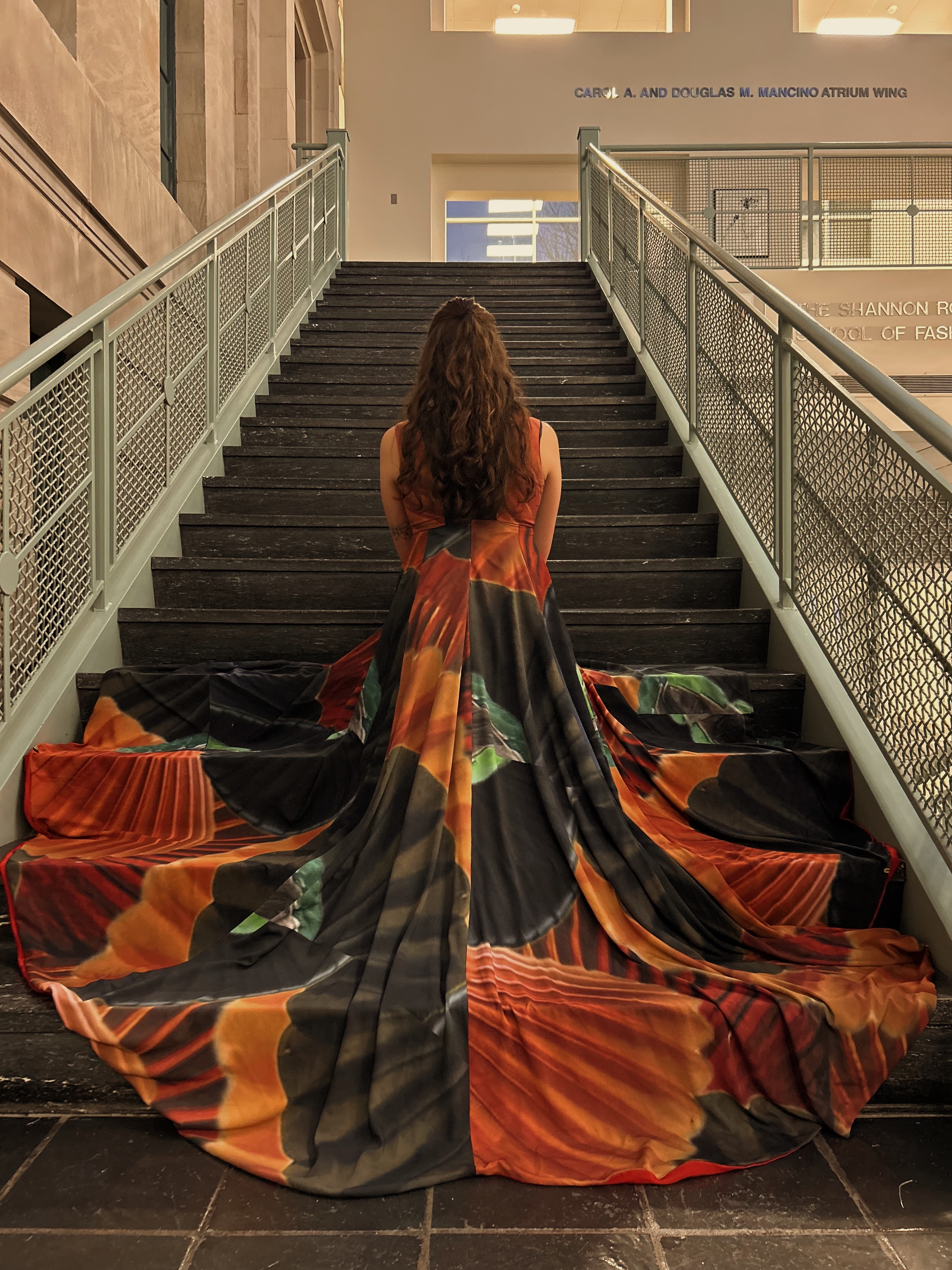 For her Junior Studio final project, Rudy designed an avant garde garment inspired by the King Bird of Paradise. Using custom textile design, dye sublimation printing, and advanced garment construction, Rudy’s work explored how fashion can capture movement, transformation, and storytelling without relying on real biological materials.