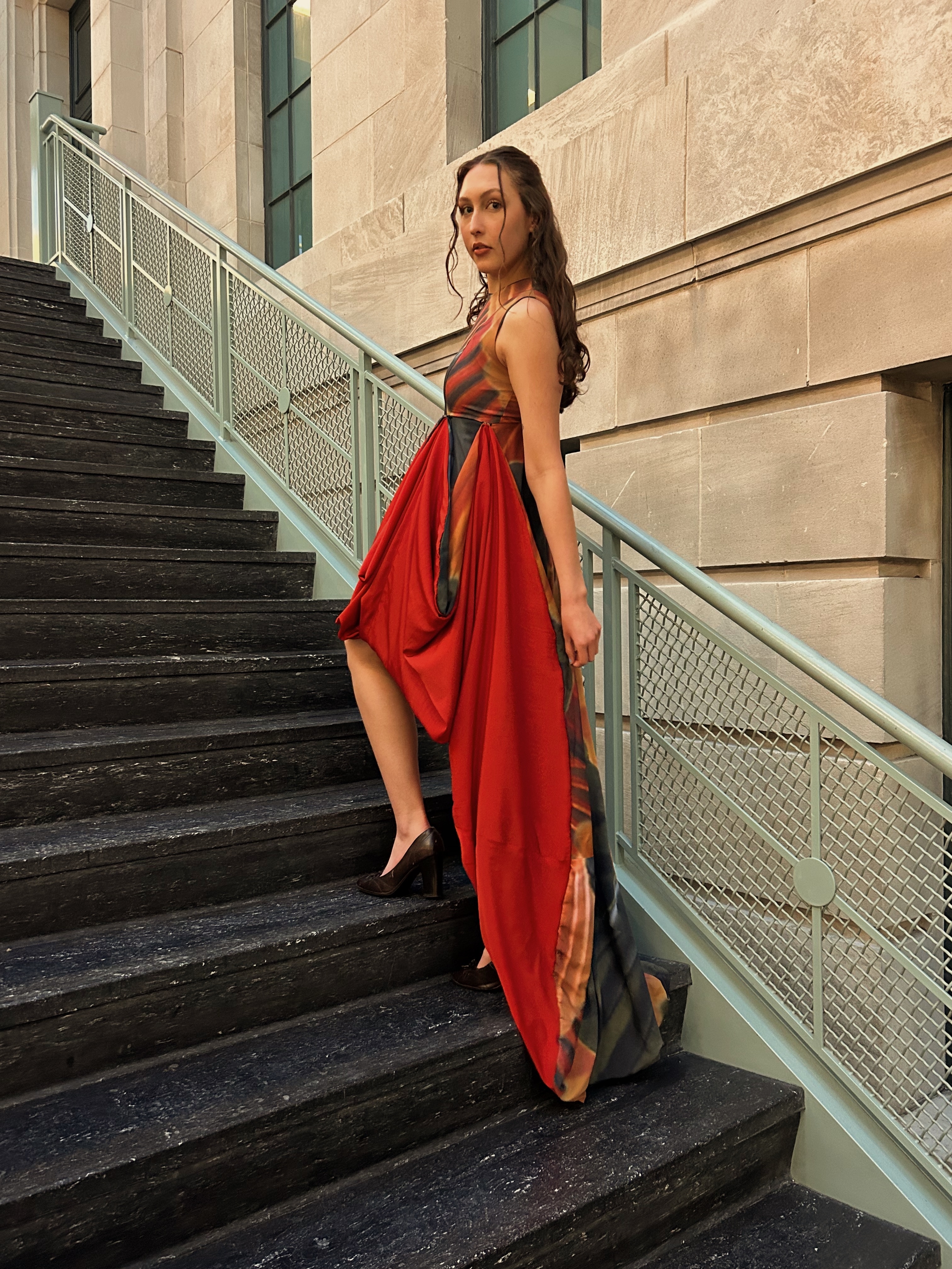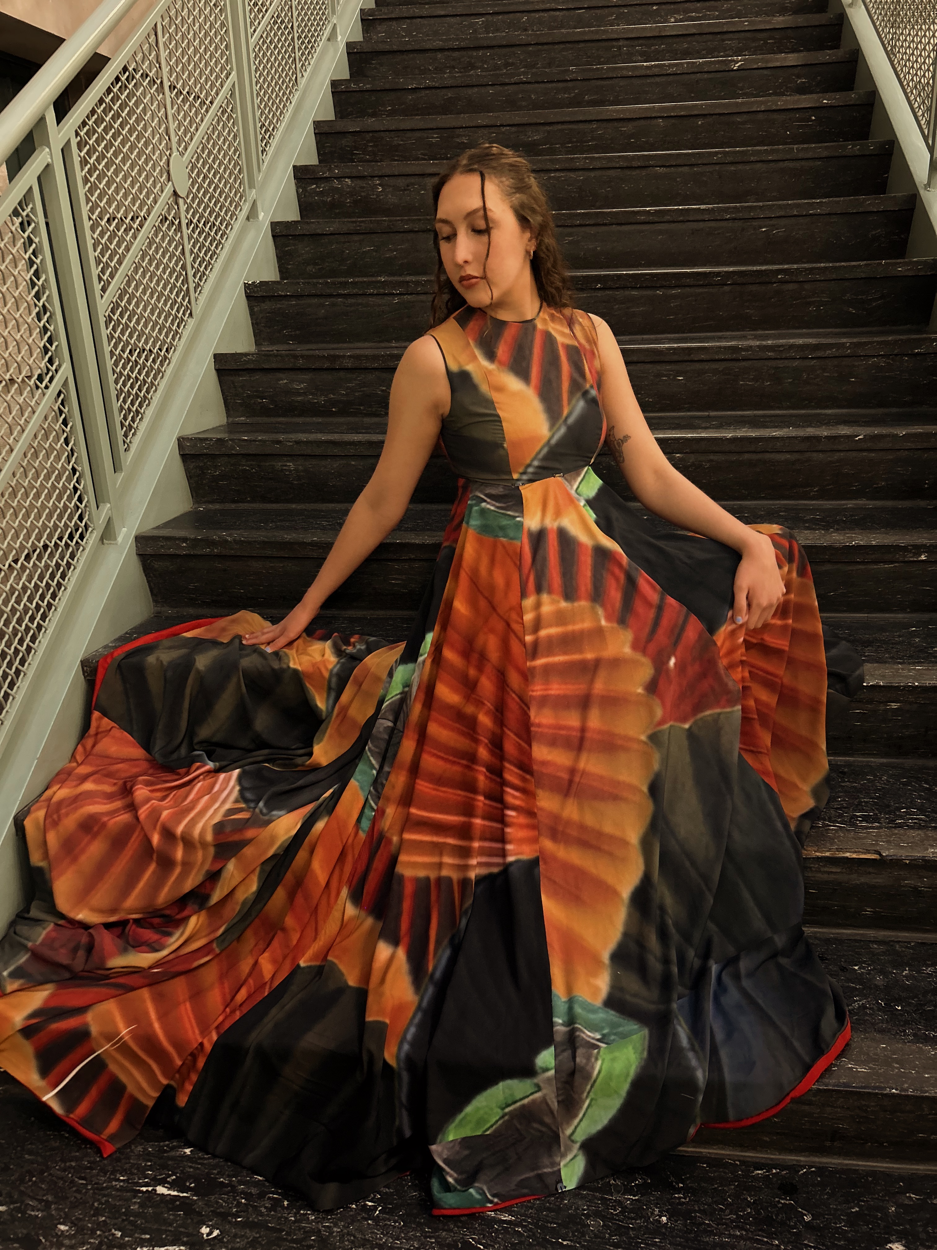 Rudy’s garment was designed to visually mimic the bird’s courtship ritual. When clipped up, the dress appears predominantly red, with the print only on the bodice. When released, the full interior print is revealed. The design has two big skirts sewn together, and the dress is sewn at the bottom, expanding into a bubble-like dress.