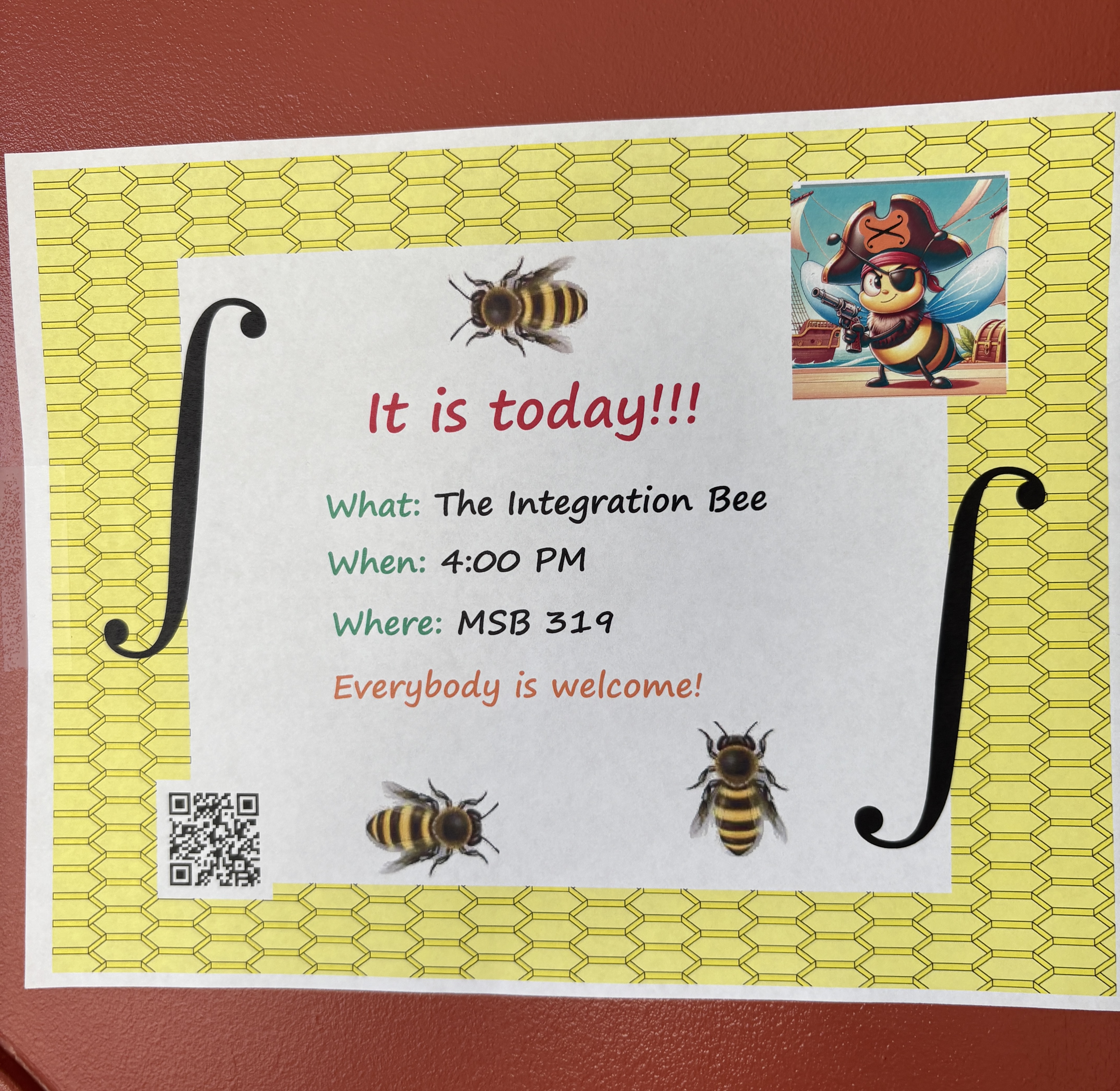 Come hang out with fellow students and faculty, enjoy pizza and prizes, and take part in the Integration Bee!