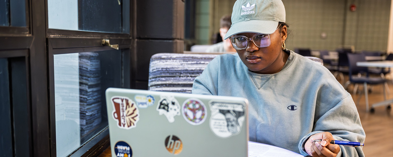 A Kent State University student works on her computer. (Photo credit: Rami Daud)